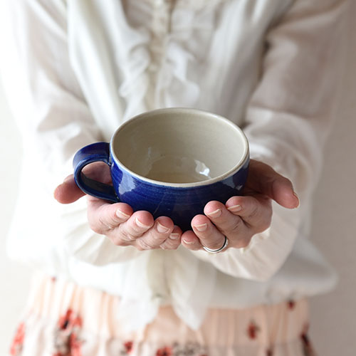 深い藍色とクリーム色のコントラストが美しい、森永淳俊さんのスープボウル。コロンとした可愛らしいフォルムが特徴的です。